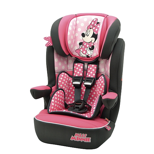 La silla de coche Micky Minnie es para el grupo 1-2-3 (De 9 a 36 kg). Tiene reposacabezas ajustable en altura, protección lateral para máxima seguridad, funda acolchada extraíble y reposabrazos regulables.